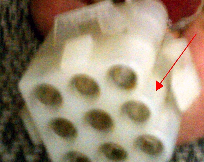 The way the wiring works is interesting. A starter relay makes or breaks a connection in the main starting circuit. The gearshift lever basically intercepts the relay’s path to ground. The electrical plug to the gearshift lever has nine holes. The brown-and-black wire goes into the top center hole, the one with the bubble-shaped side as opposed to the smooth sides.
